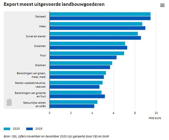 In 2020, the value of agricultural exports from the Netherlands increased by about one percent compared to 2019. That was despite the global coronavirus pandemic. Total goods exports declined by about seven percent last year. This is reported by the Dutch Central Bureau of Statistics (CBS) and Wageningen Economic Research (WUR). The report is based on a joint study commissioned by the Ministry of Agriculture, Nature and Food Quality (LNV).