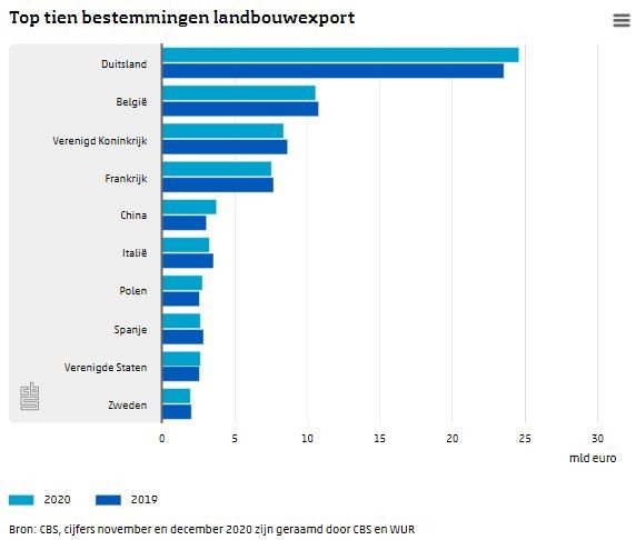 The Netherlands' top ten agricultural export destinations. From top to bottom: Germany, Belgium, the United Kingdom, France, China, Italy, Poland, Spain, the United States, and Sweden.