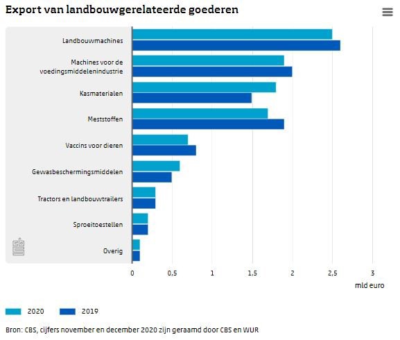 It's estimated that last year, the value of exported agriculture-related goods decreased by 0,6%. These goods are produced for the agricultural and food sectors. Farm machinery and machinery for the food industry are the most important Dutch agriculture-related goods exports. However, exports of these are four to five percent lower than in 2019. Exports of greenhouse materials grew by 19%. That's primarily due to an increase in exports of these materials to the United Kingdom. Fertilizer exports decreased by nine percent.