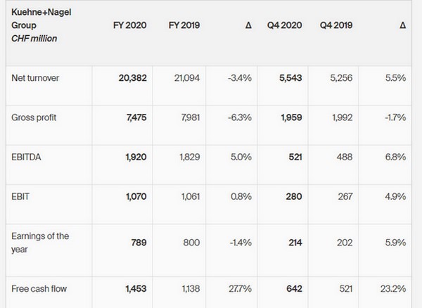 The year 2020 was characterised by a weak first and a strong second semester. Kuehne+Nagel achieved a remarkably good result in an environment marked by crisis. Operational profit was above the previous year; total reported net earnings of the year decreased only slightly compared to 2019.
