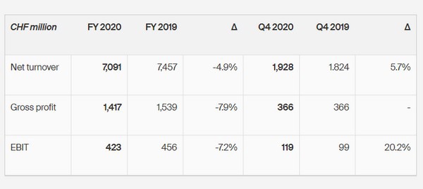 Net turnover of CHF 20.4 billion for the full year 2020 was below the 2019 figure due to lower volumes in the first half; EBIT, on the other hand, was almost one percentage point higher at CHF 1.1 billion. Currency fluctuations had a significant negative effect of -6% on both net turnover and EBIT. Free cash flow increased by 27.7%.