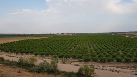Two-year-old almond grove managed with the Zaragoza method (Spain).