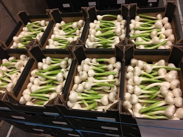 Post-harvest, the root and part of the green stem are manually clipped. They then peel the bulb so that a clean white bulb remains. Bas has recently invested a lot in storage capacity and mechanizing the weeding process. That's to reduce the time that takes. With more storage space, it's possible to deliver fresh garlic for up to six months. "Once you open a cold store, the garlic's shelf life decreases. I now have multiple refrigerated storage areas. I can, therefore, deliver the fresh garlic for longer," concludes Bas.