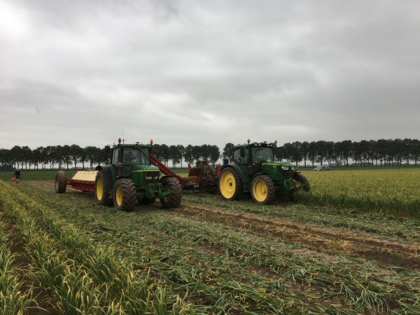 Growing organic, fresh garlic is labor-intensive on multiple levels. Weeding takes a lot of time, and during harvesting, much is done by hand. "That's to avoid damaging the garlic," says Carel. This product is harvested by lifting it with a clamping band system. The garlic is pulled out of the ground by its leaves. The bulb is left untouched and, thus, undamaged.
