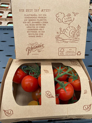 Since then, many growers and importers have started using this packaging under private labels. That includes the German tomato-growing Bong family. For Michael Bong, this fulfills a wish. "One of our retail customers told us they want to remove all plastic packaging. We'd been supplying our tomatoes in this for years. So we started trawling the Internet. We wanted to find a fun, attractive, but above all, more natural way to package our tomatoes. When we saw AGF-Holland's packaging line we loved it right away," he says.