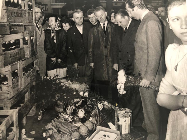 Grandfather Albert (in black suit) together with King Albert II (grey suit with flowers) at the early market in Brussels 1968. The girl in white is Cedric's mother: Eliande De Ridder