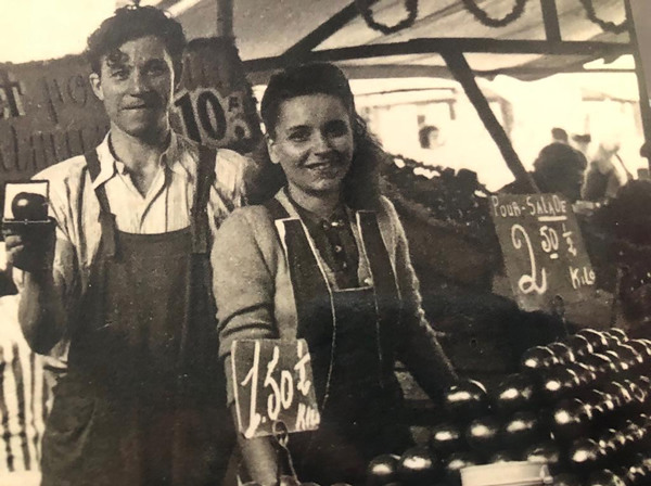 Cedric's grandfather and grandmother with their fruit and vegetable stall.
