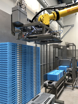 So, Lan Handling Technologies designed a de-palletizer with a special gripper. It automatically removes stacks of foldable crates from the H1 pallets. The same gripper stacks the empty pallets too.