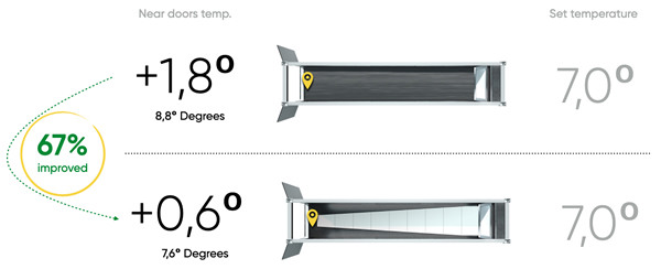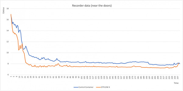 The study found that temperatures at the doors of the containers in which the OTFLOW was placed, was always closer to the set temperature than those without the technology. In both cases, the cooling unit recorder readings were very similar to the set temperature. There were recorders at the containers' doors. These showed that the containers with the OTFLOW mats also reached the set temperature faster than those without them. See the graph below.