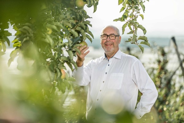 Michael Büser, managing director of the OvB, in the orchard of an affiliated grower in Friedrichshafen on Lake Constance.