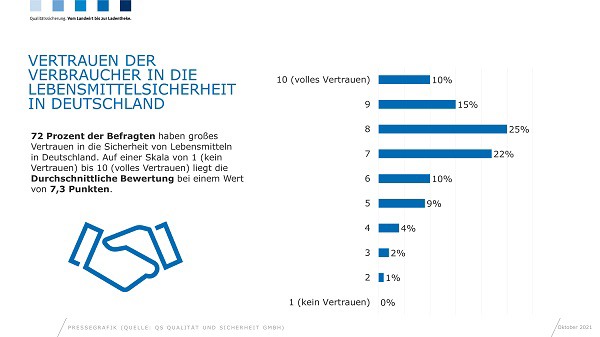 For consumers, food safety is understandably very important. At the same time, trust is very high here. For producers and retailers of fresh food, this is both a success and a mission, says Dr. Alexander Hinrichs, Managing Director of QS Qualität und Sicherheit. Consumer confidence also confirms the joint commitment of the 180,000 system partners in the QS scheme. The strict focus on safety across company and industry boundaries - from the farmer to the store counter - has made the QS scheme great and our food safer. But trust is a very sensitive commodity. Maintaining and increasing it through constant commitment is our driving force at QS.