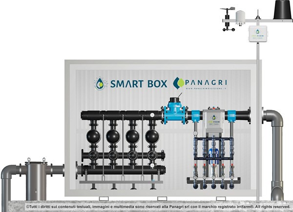 Irrifarm is a complete system for the remote management of irrigation thanks to which it is possible to monitor field valves and fertilization, measure field and climatic data, monitor irrigation and plan agronomic techniques. The series of professional equipment is found in a single box that is 3 meters long, 2 meters wide and 2.70 meters high.