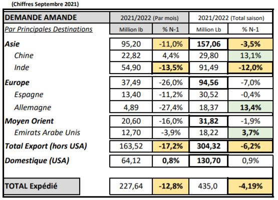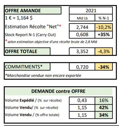 The 2021 harvest is almost finished now. Receipts remain heterogeneous in terms of quality and quantity depending on the region and variety. The volumes recorded to date are higher than last year (1.068 billion Vs 1.052), but this does not augur a larger total harvest. Indeed, the harvest started earlier this year (which explains the difference with N-1) ; in addition, the yields observed are generally 8 to 15 % lower than last year and are accompanied by a significant presence of small and damaged almonds. These elements tend to confirm that the crop will be around 2.8 billion Lbs. ( = objective expectation). Farmers severely affected by the drought are pulling out the worst performing orchards. Smaller crop size, higher production costs and fears of possible drought consequences are causing farmers not to commit to forward sales.