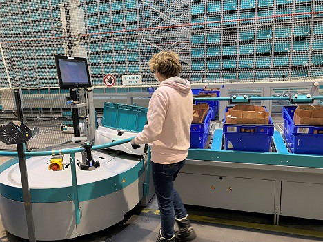 Preparation station. The dry area has 8 stations and the operators retrieve the products carried by the robots to place them in the blue crates.