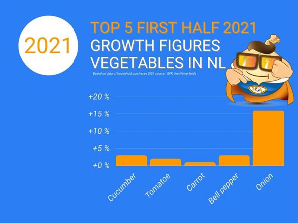 The first half of 2021 also saw a considerable increase in domestic fresh onion consumption. That grew by no less than 16%. So, the onion is by far the fastest-growing vegetable in the Netherlands. Part of this increase can be attributed to eating more at home as restaurants were less accessible. But apart from that, it offers an opportunity for onions to become even more beloved in the kitchen. Sales of both tomatoes and cucumbers lag far behind. They show meager growth figures of 'only' two and three percent.