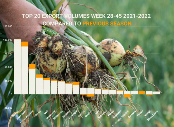 Ivory Coast remains a large sales volume gainer. But, Senegal seems to be gradually catching up. Another big volume riser is Nicaragua. This season, Dutch onion exports to that country have more than doubled to over 16,000 tons. But neighboring Central American countries, El Salvador and Honduras, too, are well there. On the Asian continent, substantial growth is taking place in Taiwan. And there is continuing growth in Hong Kong. Taiwan currently takes more than 6,000 tons, putting it in 18th place in the top 20. That is up from 100th place.