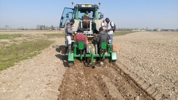 Once the soil has been prepared, the plants must be planted in spring in temperate soil at a depth of 20-30 cm. The transplanting machine requires four people on board the machine, of which two are needed to prepare the nursery material and two to place the plants in the appropriate slots, and an operator who drives the 70-80 Hp tractor. The machine is capable of performing the following operations: opening the furrow, laying the sub-irrigation pipe, laying the rootstock in single or twin rows, and covering the rootstock with approximately 10-15 cm of soil.