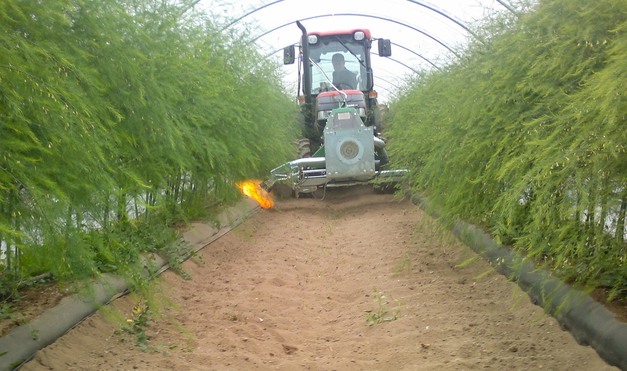 Weed control is one of the major issues facing asparagus producers today, along with the fight against fungal diseases. One of the recommended practices after the mowing of the vegetation is to remove it and burn it. The aim of this operation is the partial or total elimination of fungal pathogens such as Stemfillium and Rust, which can cause serious damage to asparagus. Burning residues on the ground also provides excellent control of weed seeds present on the surface of the soil. To overcome this problem, machines using heat produced by LPG combustion can be used.