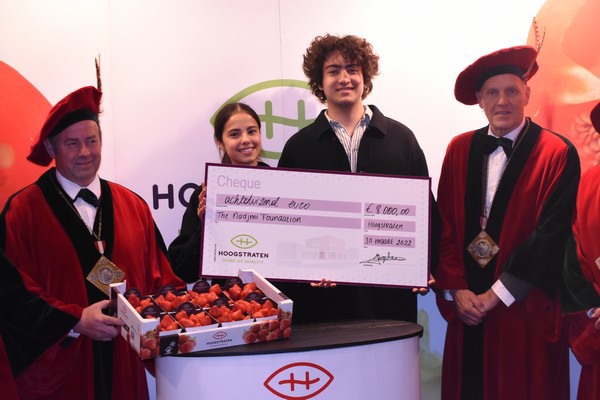 The 'Ghesellen van de Aardbei' were among the attendees when the check was officially handed over to Julie and Kian Nadjmi, Dr. Nadjmi's children. They received it on behalf of the Nadjmi Foundation. Dr. Nadjmi could not be there but sent a video message of thanks to the guests.