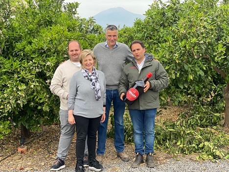 Above in photo, from left: Fabrizio Strano of Amara, Gerardo Diana president of the Consorzio Arancia Rossa di Sicilia Igp, Edorado Strano of Amara. The woman in the foreground is Maria Strano (mother of the two entrepreneurs and brothers).