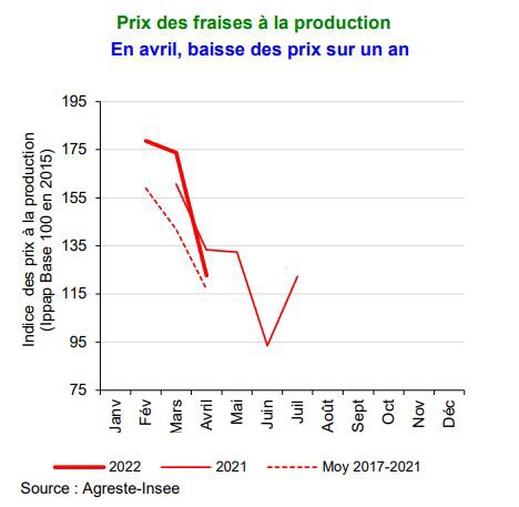 According to the first estimates on May 1st, 2022, the surface area used to grow strawberries in 2022 is stable compared to 2021, with 4,036 ha. The annual French production is estimated at 76,000 tons, which is 1% higher than last year. The 2022 production campaign started later due to the higher energy costs for greenhouse production. In cumulative terms, at the end of week 18, the harvests were 28% lower than last year but gradually accelerated in May and June. According to the Agreste report, the distribution of the offer is also less balanced than last year.