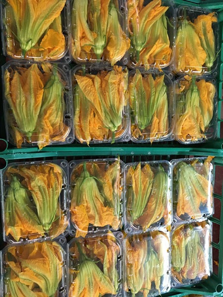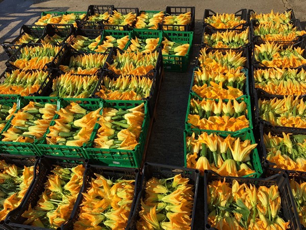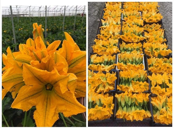 "Harvesting takes place from 5:30 am to 8:00 am in the morning. The flowers are immediately moistened with nebulous spray, covered with a damp cloth, and then placed in a cold room with a temperature of 2-3 °C before leaving for their destination. The courgette is a monoecious species. This means that the same plant has both female flowers (which will produce the fruit) and male flowers. Fioretta, or the male flower, is used in cooking to prepare various dishes. Another product that does well is courgette fleur, the female flower with a fruit attached."
