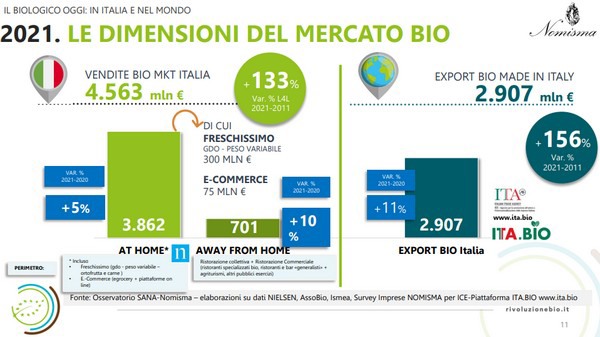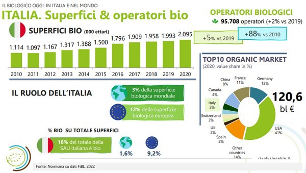 Since 2008, the domestic organic market has grown +233% with a more than positive performance of organic exports: in 2021, sales of Italian organic agri-food products on international markets reached 2.9 billion euros (+671% compared to 2008).
