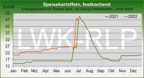 German early potatoes dominate the assortments. Early imports more or less supplement the range. Food retailers are mainly supplied with regional produce. Producer prices were reduced this week. As demand is not quite keeping up with the good supply, also due to high summer temperatures, prices are expected to tend to fall. The upcoming summer vacations could further reduce sales, the Rhineland-Palatinate Chamber of Agriculture writes.