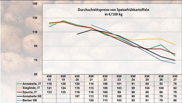 In this state, trading activity on the potato market is restrained, the Schleswig-Holstein Chamber of Agriculture reports. Among other things, demand is described as slow due to the holidays. Prices are falling and a further price decline is expected towards the weekend. The supply in the stores continues to be determined by supra-regional early potatoes, for example from the Palatinate. The switch to regional early potatoes is taking place slowly.