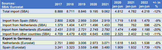 According to the German CBS (SBA), in 2022's first half, that country imported 970,000 tons of fresh fruit and vegetables from the Netherlands. That is 20% less than the 760,000 tons in the first half of 2021. This source shows imports from the country where the crop is grown. In this case, imports of Dutch-grown products.