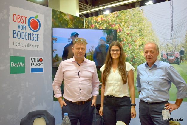 Markus Schraff and Larissa Lorch from Obst vom Bodensee Vertriebsgesellschaft (OvB) and Hans-Josef Stärk from BayWa Obst & Co at the OvB stand at the Biofach trade fair 2022.