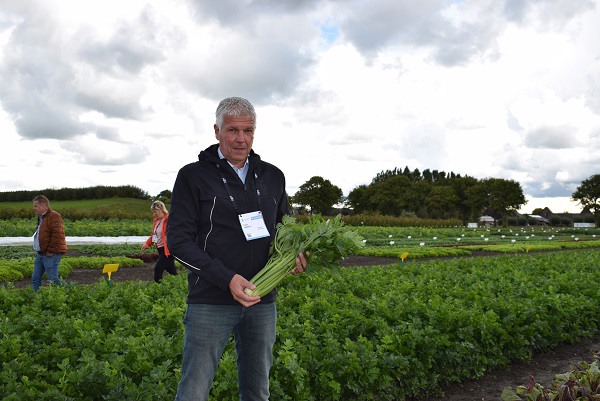 Peter Gabriels, Bejo's Benelux director, shows a new robust celery variety, Cumbia, which is very Septoria resistant, has healthy foliage, and is suitable for flow packing, processing, and sticks.