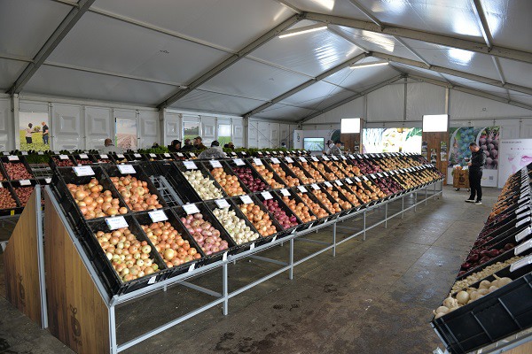 Robust onion varieties, including Hylander, Redlander, and the shallot, Innovator, on display.