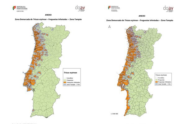 Areas infested with Trioza erytreae on October 1, 2021, and October 14, 2022, according to the Direcçâo Geral de Alimentaçâo e Veterinària de Portugal