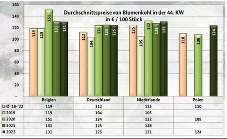 Domestic cauliflower shipments dominated the market in terms of importance, with Belgian lots coming second. Shipments from the Netherlands and Poland did have more than a supplementary character. According to the BLE, the first French products appeared in Munich, but they were quite expensive and this meant they garnered little attention.