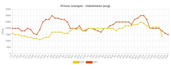 According to EastFruit price monitoring, the average wholesale price for oranges in Uzbekistan decreased from 21 000 to 14 000 UZS/kg from 9 to 16 December 2022 – by 33% in one week.