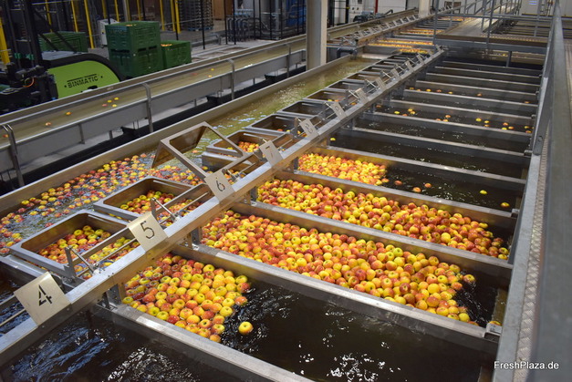 "Based on the combination of sorting criteria, i.e., size, weight, base color, cover color, skin defects, etc., the apples are divided into a maximum of 25 sorting groups and collected in the defined water channels before being gently filled back into large crates and labeled. We can sort here in steps of up to 2 mm, for example to be able to pack packs with a fixed weight of 600 g as accurately as possible. This is because the more precisely we achieve the defined target weight, the lower the "weight-in", which has a positive effect on the prices paid out to the producers.