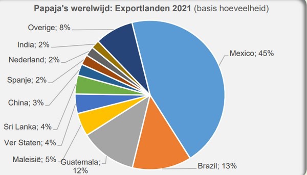 Only a few suppliers call the shots on the world's papaya market. While India is by far the leading producer, it exports little. Mexico is the main exporter, with Brazil in second place. Guatemala also exports quite a lot. Malaysia, the United States (most re-exports), Sri Lanka, China, Spain (incl. re-exports), and the Netherlands (re-exports only) follow at a distance.