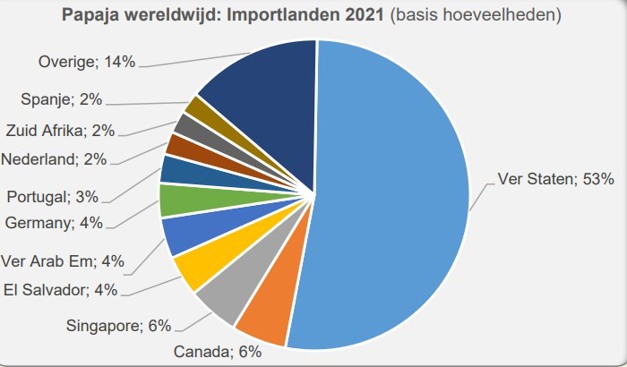 In total, annually, between 350.000 and 375.000 (net) tons of papaya are traded internationally. That is less than three percent of total global production. In 2021, exports from all countries totaled €280 million. Mexico exported €95 million worth of papayas, and Brazil €43 million. Imports from all countries were considerably higher at €340 million.