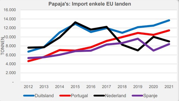The Netherlands was the main European Union buyer until 2017 when Portugal took over. Last year, though Dutch imports from Brazil fell by 40%, the Netherlands remains the second largest buyer in the EU. Imports of Brazilian products also decreased to Germany, Spain, and France. Italy took more, but (still) in smaller quantities. If the trend of those first nine months continues, 2022's EU imports of Brazilian papayas will amount to about 30,000 tons. That is the smallest quantity since 2016.
