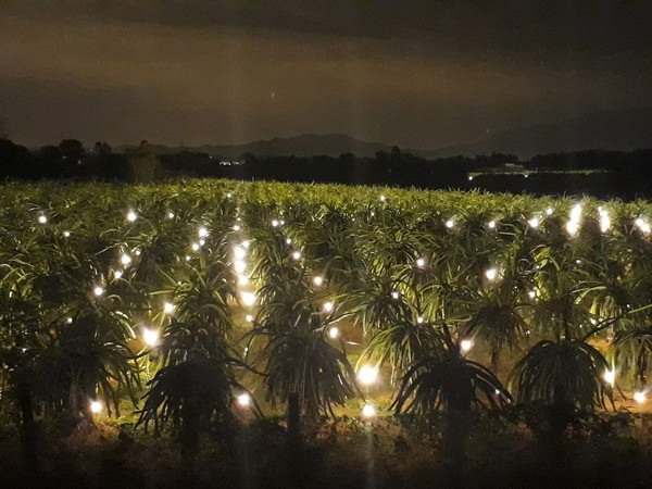 Dragon fruit orchards with and without artificial lighting. Artificial lighting makes year-round production possible.