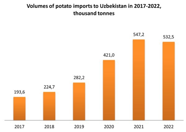 According to international trade statistics, in January-December 2022, the volume of imports of potatoes to Uzbekistan amounted to 532 500 tonnes, which is 14 700 tonnes or 2.7% less than in 2021.