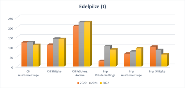 Despite a slight decline in the overall Swiss market from 13,537t in 2021 to 12,906t in 2022, Swiss mushroom cultivation is still on track. Particularly pleasing is the development of Swiss organic mushrooms with +89% compared to the previous year and the increased market share to 50% for noble mushrooms. A minimal decline is recorded in the fresh market of Swiss mushrooms, which fell with about - 5% compared to the previous year. Swiss shiitakes and others are at a similar level to 2021.