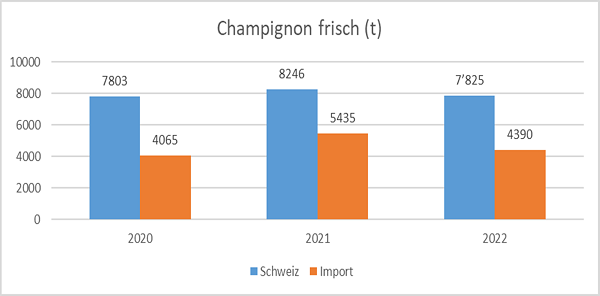 Despite a slight decline in the overall Swiss market from 13,537t in 2021 to 12,906t in 2022, Swiss mushroom cultivation is still on track. Particularly pleasing is the development of Swiss organic mushrooms with +89% compared to the previous year and the increased market share to 50% for noble mushrooms. A minimal decline is recorded in the fresh market of Swiss mushrooms, which fell with about - 5% compared to the previous year. Swiss shiitakes and others are at a similar level to 2021.