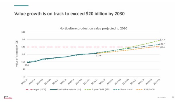 In 2021/22, the production value of Australia’s horticulture industry grew to $15.62billion (up 3% on the previous year), with value growing from $6.15billion in 2012/13.