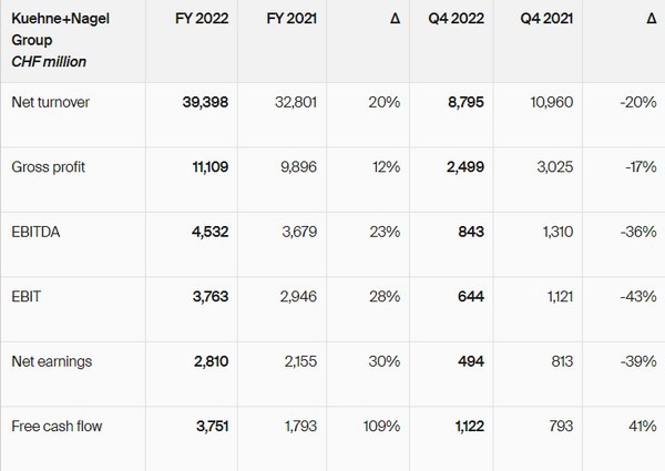 Kuehne+Nagel closed the 2022 financial year with an exceptionally strong result. Group net turnover increased by 20% to CHF 39.4 billion, EBIT by 28% to CHF 3.8 billion and net profit by 30% to CHF 2.8 billion. The conversion rate, which describes the ratio of EBIT to gross profit of the Group, was 33.9%. All business units contributed significantly to the company's success. Due to the overall economic slowdown, the result in the fourth quarter of 2022 was weaker compared to the rest of the year.