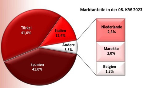 In the case of TOVS, Turkish and Spanish deliveries predominated, with Italian tomatoes making up the bulk. Cherry tomatoes came primarily from Italy and Spain, while Turkey and Spain set the tone for beef tomatoes. Round tomatoes came in mainly from Morocco, Turkey, and Spain. Due to the low availability, the Dutch and Belgian shipments were rather small for this time of the season. According to the BLE, they generally had only a supplementary character. In addition, Spanish lots continued to have limited availability. As a result, Turkish shipments benefited the most. However, the coloration of the Turkish and Moroccan batches was not always convincing.