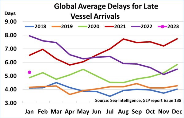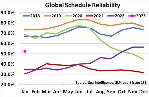 Sea-Intelligence has published issue 138 of the Global Liner Performance (GLP) report, with schedule reliability figures up to and including January 2023. As the report itself is quite comprehensive and covers schedule reliability across 34 different trade lanes and 60+ carriers, this press release will only cover the global highlights from the full report.