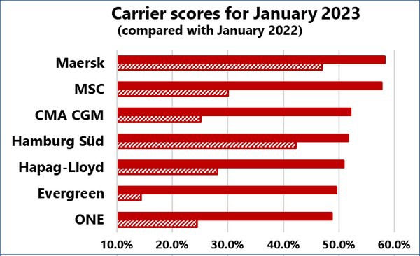 Maersk was the most reliable top-14 carrier in January 2023 with 58.3%, followed by MSC with 57.7%. There were 3 more carriers with schedule reliability of over 50%. The remaining carriers all had schedule reliability of 40%-50%. ZIM was the least reliable carrier in January 2023 with schedule reliability of 41.0%. All top-14 carriers recorded a M/M decline in schedule reliability in January 2023, with Hapag-Lloyd recording the smallest decline of a marginal -0.4 percentage points. Wan Hai was the only carrier with a double-digit decline of -15.4 percentage points. All carriers except for Hamburg Süd recorded double-digit Y/Y improvements in schedule reliability in January 2023.