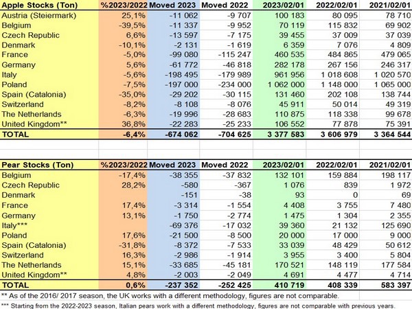 WAPA, the World Apple and Pear Association, released the apple and pear stock figures for 1 February 2023. The figures show that in Europe apple stocks decreased by -6.4% compared to 2022 to reach 3 377 583 T, while pear stocks also increased slightly by 0.6% to reach 410 711 T. In the USA, apple stocks as of 1 February 2023 stood at 1 370 137 T (-7.33% compared to 2022), while pear stocks declined to 130 280 T (-1.9% less than 2022).